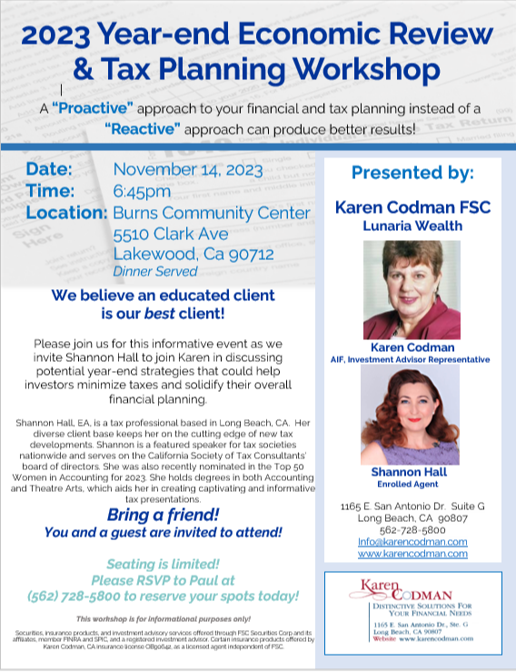 Please join us for this informative event as we invite Shannon Hall to join Karen in discussing potential year-end strategies that could help investors minimize taxes and solidify their overall financial planning.